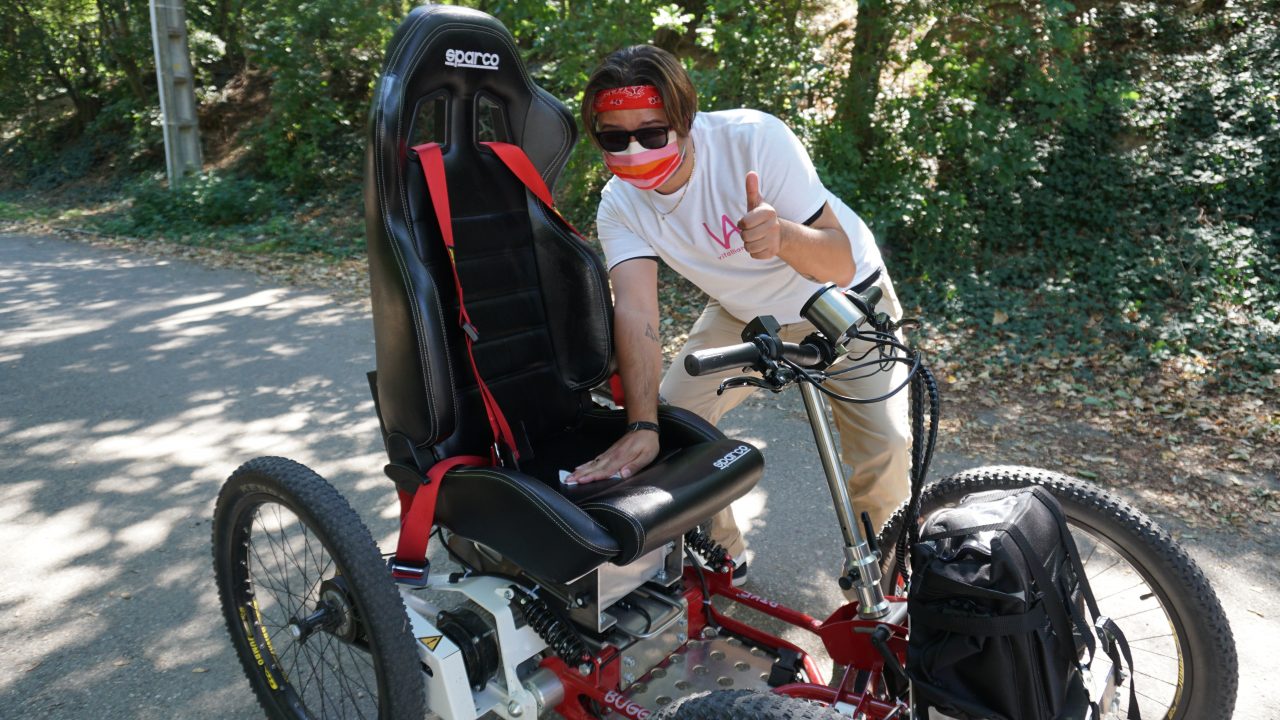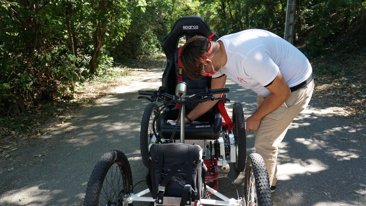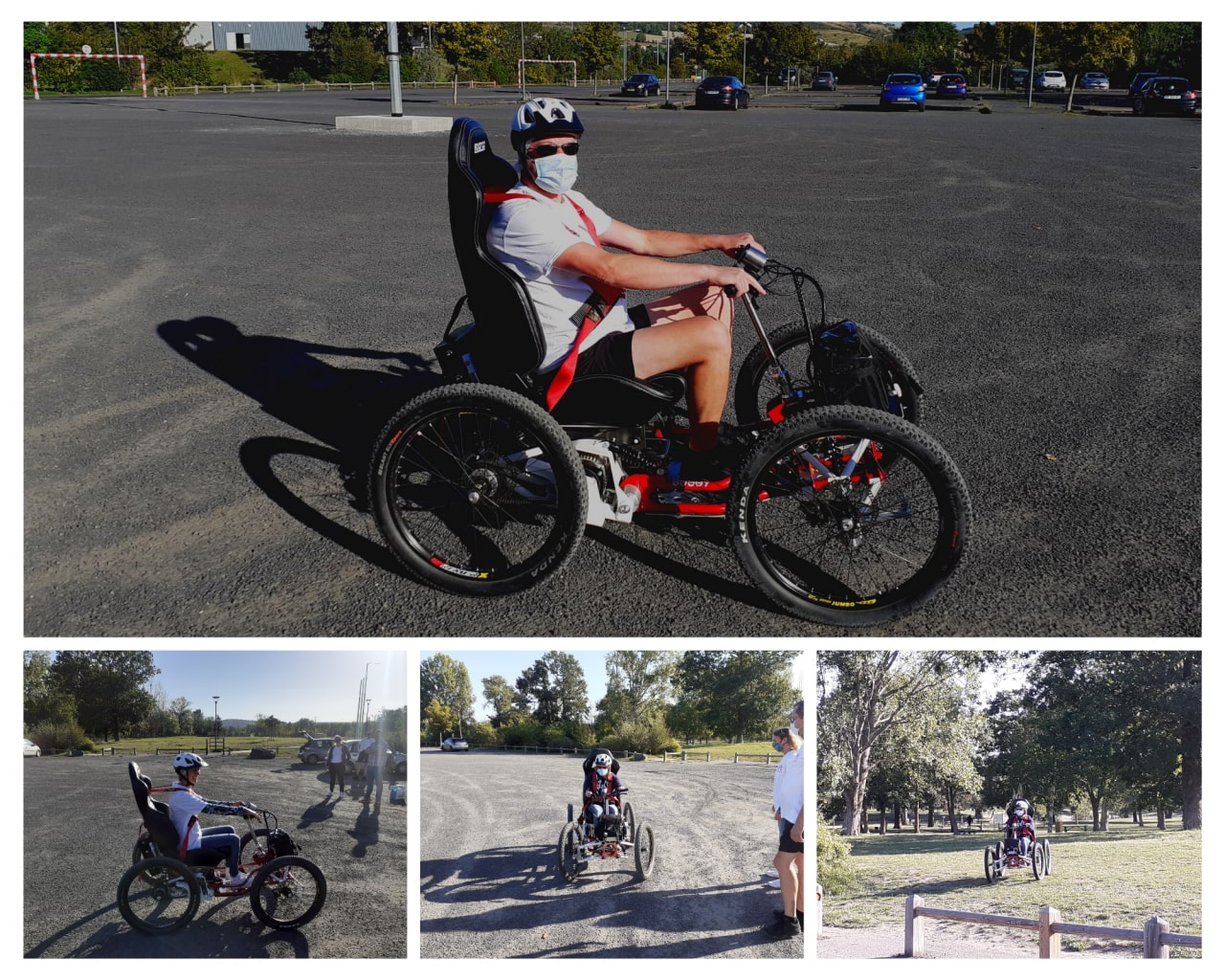 Vers 9h30, les participants arrivent, et les premières réactions à la vue du fauteuil ne se sont pas fait attendre « Il ne passe pas inaperçu avec sa couleur rouge, ça donne envie de l’essayer ! ». Aussitôt dit, aussitôt fait. Ou presque. Il faut avant cela, bien sûr, une petite démonstration sur l’utilisation du fauteuil et surtout revêtir l’équipement nécessaire pour rouler en toute sécurité et dans le respect des règles sanitaires. Gel désinfectant, masque, charlotte, casque, ceinture de sécurité… tout est prêt, l’événement peut enfin démarrer.